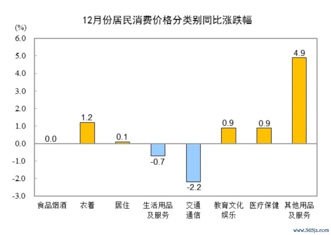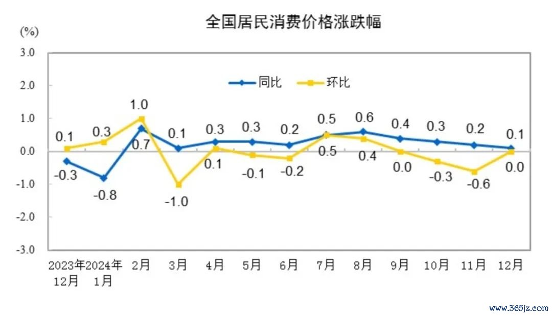 2024年12月,CPI同比上涨0.1%,涨幅比2024年11月回落0.1个百分点。
