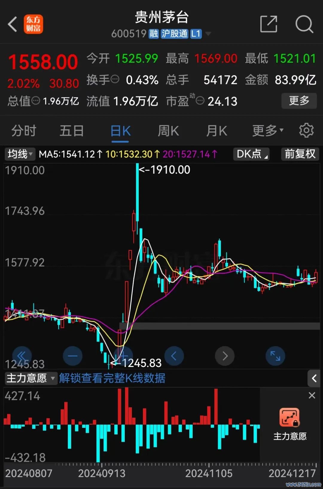 数据显示,截至12月17日收盘,贵州茅台股价报1558元/股,总市值为1.96万亿元。